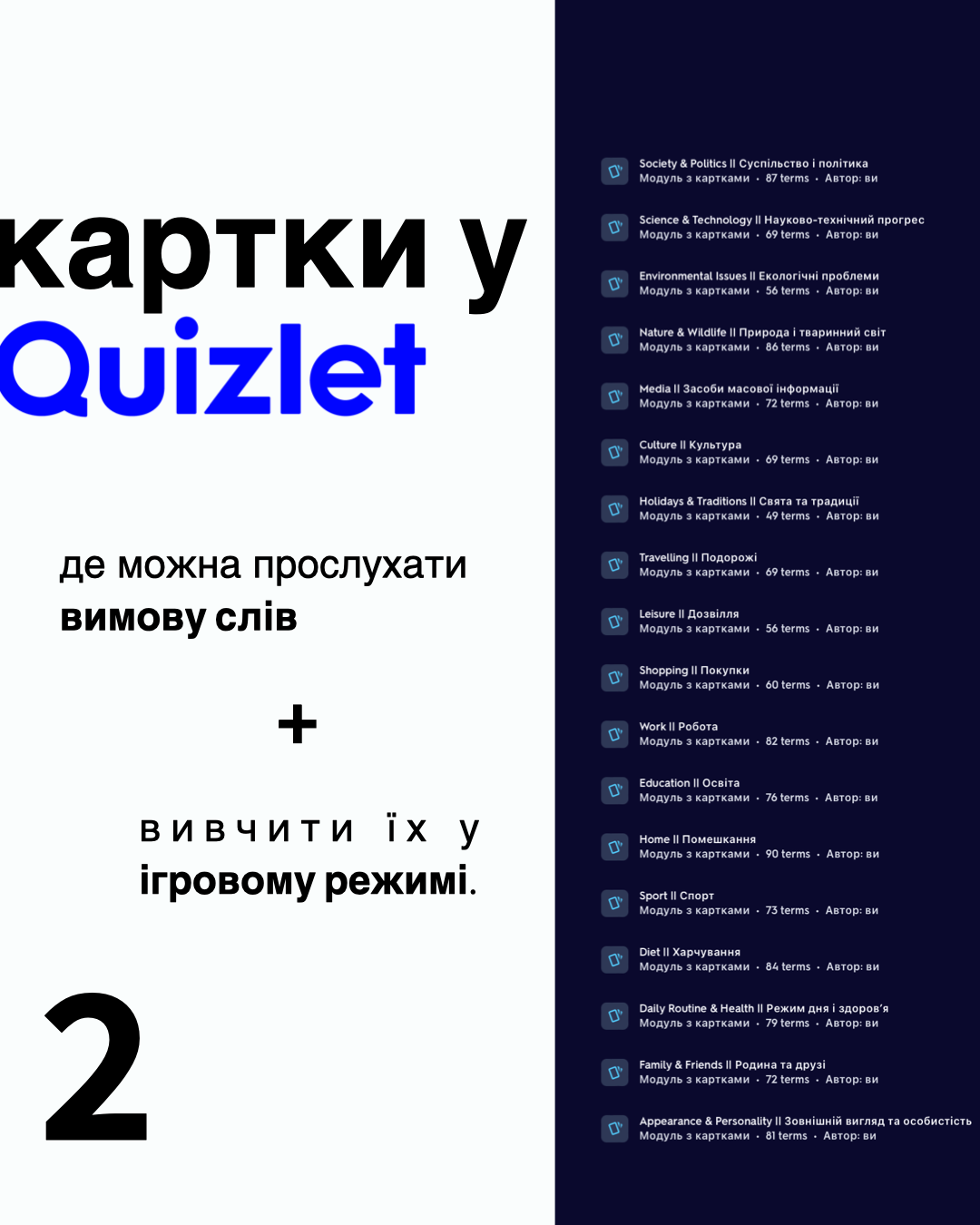 2️⃣ Картки у Quizlet, де можна прослухати вимову слів та вивчити їх у ігровому режимі.