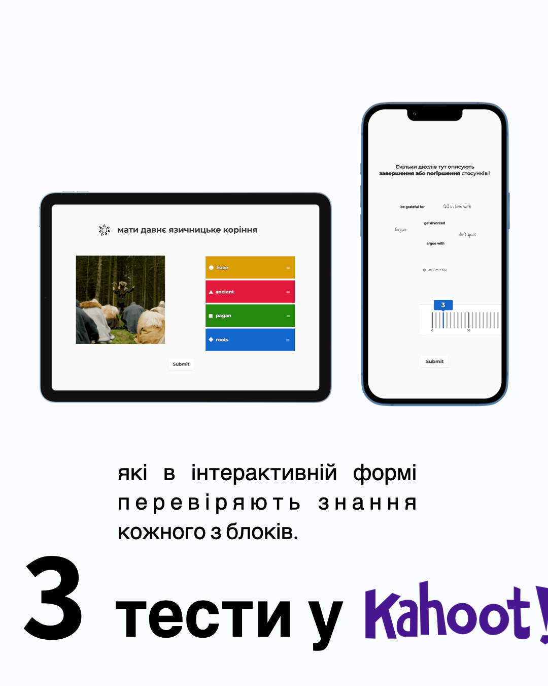 3️⃣ Тести у Kahoot, які в інтерактивній формі перевіряють знання кожного з блоків.