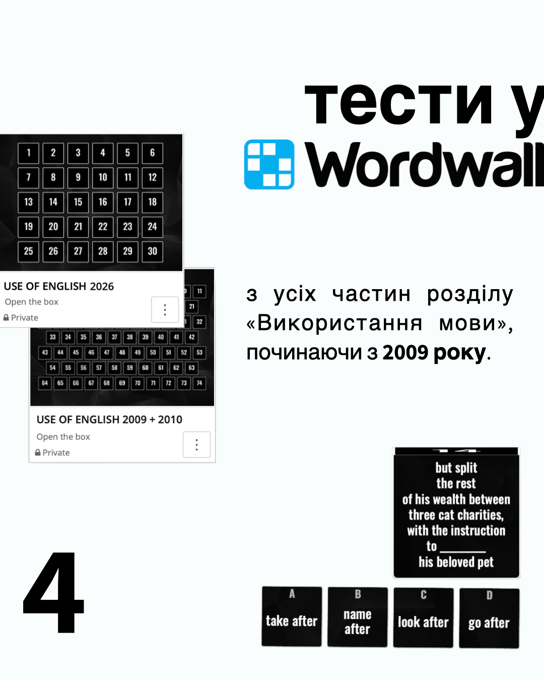 4️⃣ Тести у Wordwall з усіх частин розділу «Використання мови», починаючи з 2009 і до сьогодні.