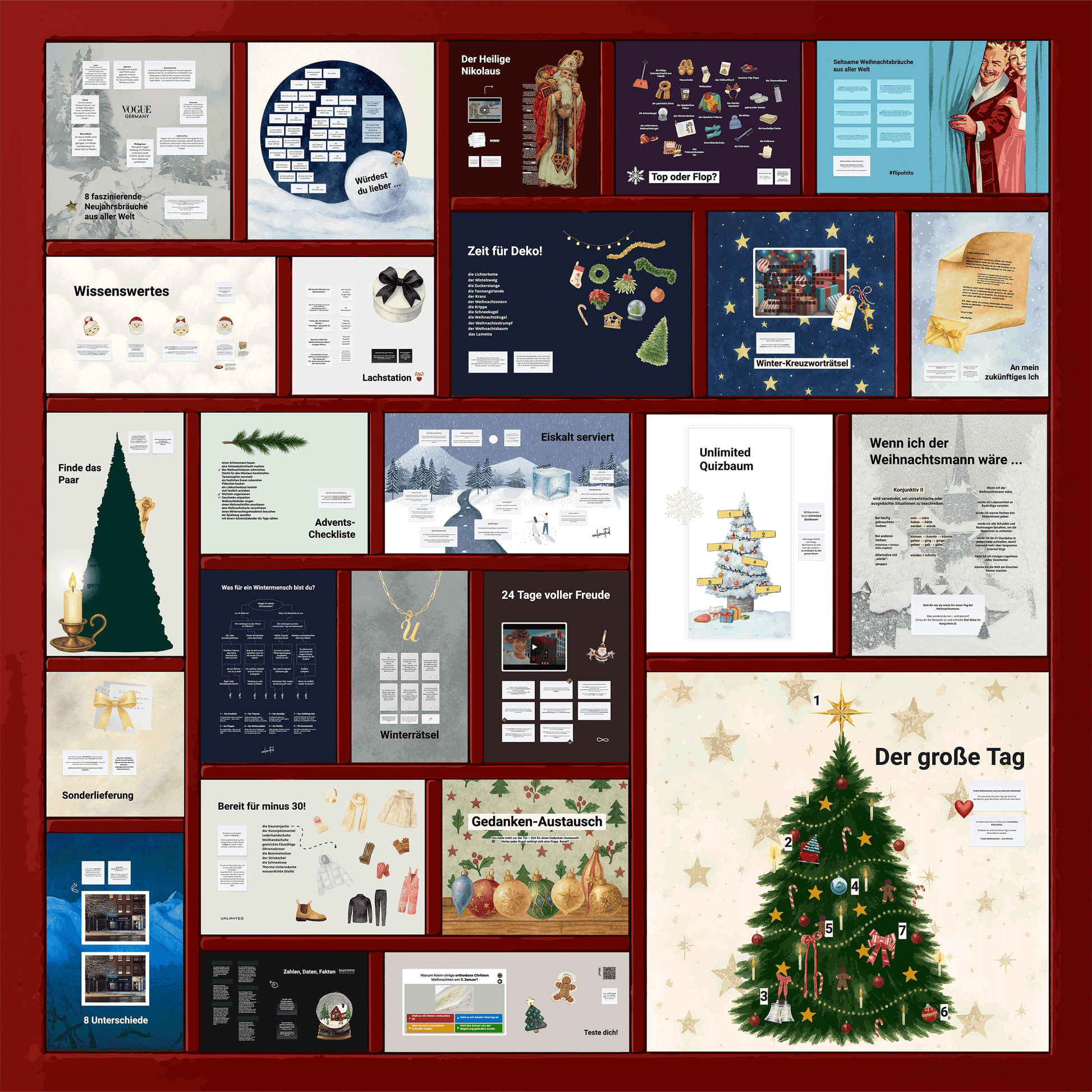 1 — Warm-up-Fragen 2 — Winterkleidung 3 — Persönlichkeitstest 4 — Rätsel 5 — Festtagsdeko 6 — Nikolaus-Video + Lückentext 7 — „Würdest du lieber…?“-Fragen 8 — Brief an dein zukünftiges Ich 9 — Magisches Genially-Quiz 10 — Konjunktiv II: Wenn ich der Weihnachtsmann wäre… 11 — Ungewöhnliche Neujahrstraditionen 12 — Wordwall-Kreuzworträtsel 13 — Weihnachtsstatistiken + Zuordnung 14 — Festtagswünsche 15 — Unterschiedssuche 16 — Synonymsuche 17 — Memes & Witze 18 — Advents-Checkliste 19 — Redewendungen zum Winter 20 — Geschenkediskussion 21 — Ungewöhnliche Weihnachtstraditionen 22 — Adventskalendervideo + Diskussion 23 — Weihnachtsfakten 24 — Kahoot-Quiz 25 — Songs, Rezepte, Reflexionen & Vorsätze